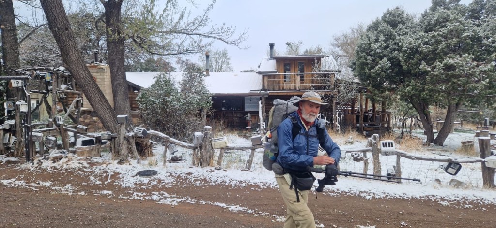 We slept in until 6:00 this morning and were hiking by 7:00. We had about 16 miles to go before the trail would become a road walk alongside a paved road, and 12 miles into Silver City. The weather forecast was not pleasant, and we’d need to camp before the road walk, since there are no places to camp along the highway. It would be a short day, since we weren’t into a 28-mile day. So One-K had contacted Susie, a local trail angel, and arranged for her to pick us up and house and feed us for the night. Much better than camping in snow and rain and temperatures in the 20s.