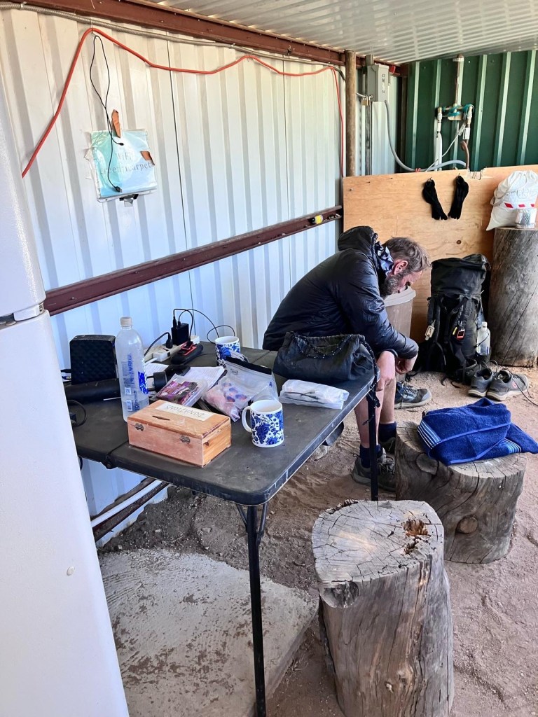 We hoped to find a spot 2 or 4 miles up the trail, but the wind was strong and we saw no suitable sites. So we ended up pushing on to the cache, where we found Spokes already set up in his tent. We found spots for our tents, somewhat protected from the wind and pitched our homes for the night. The wind steadily decreased and it looks like a more comfortable night than last night. One-K cooked dinner – instant mashed potatoes with cut up chunks of a teriyaki meat stick. Delicious after 27 miles.