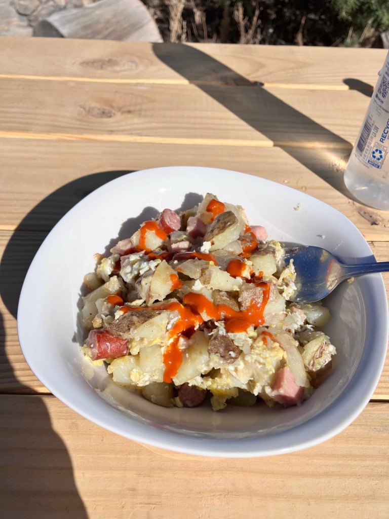 For dinner, Spokes took some potatoes and onions and eggs from the refrigerator, added in some Spam and chopped up meat sticks from our food sacks, and whipped up a gourmet hobo hash.