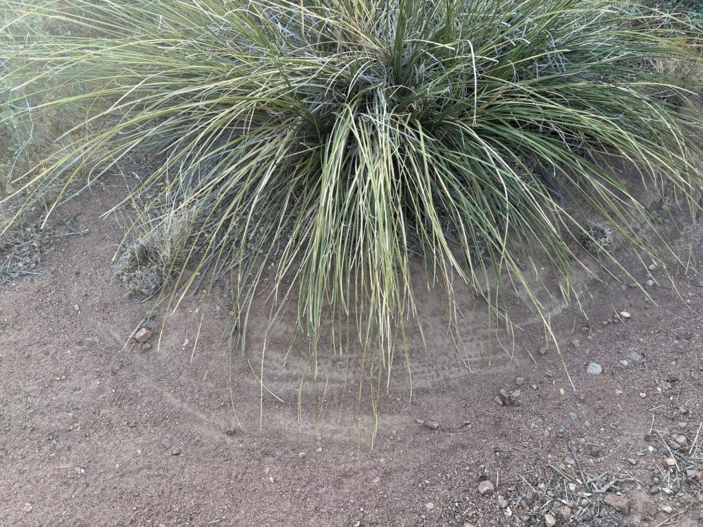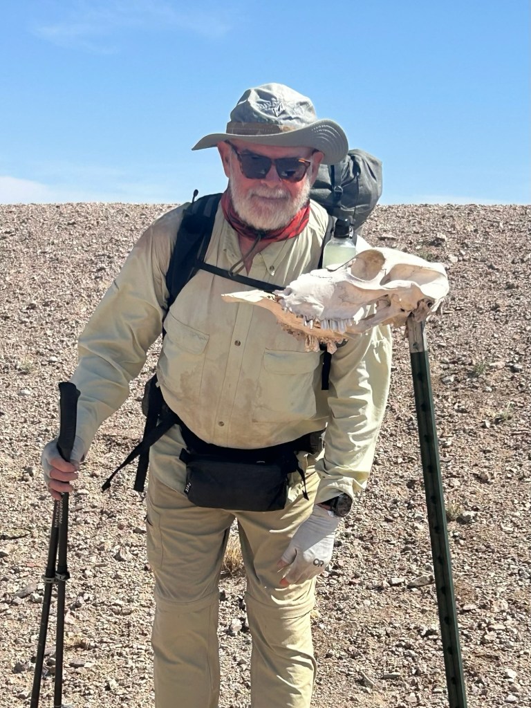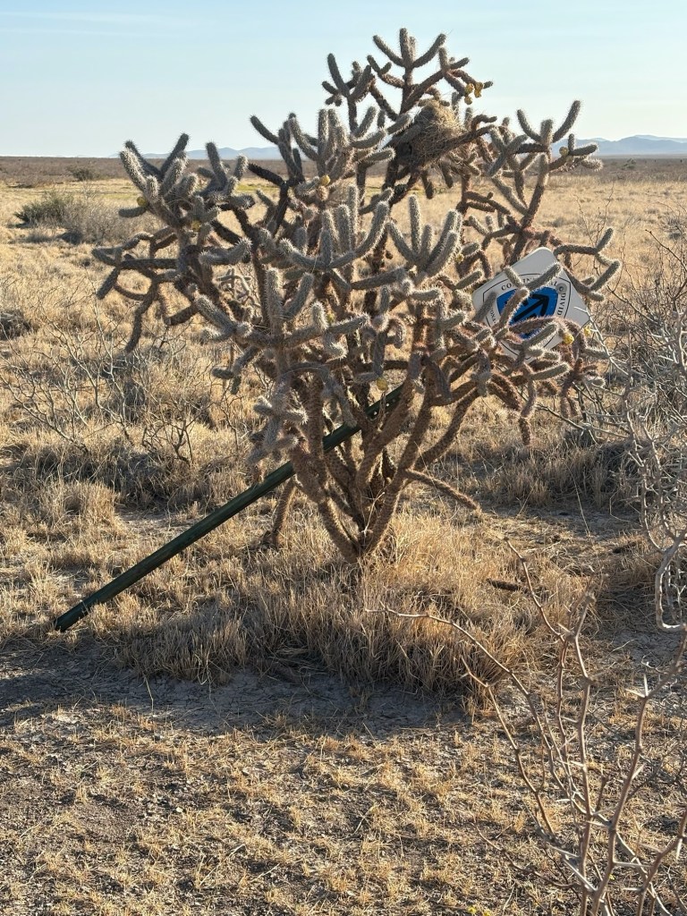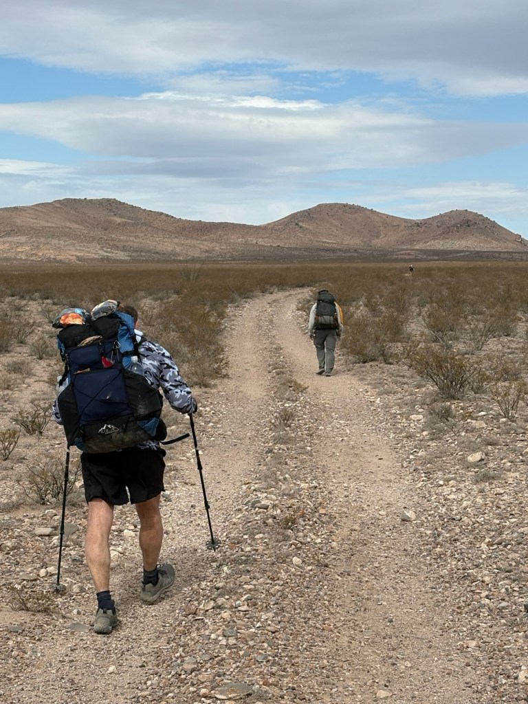 The trail has been exceptionally well-blazed, with trail signs usually at least visible from one sign to the next. Yesterday we saw 7 blazes at one time. But today was different. We crossed a very large flat and desolate area, with trail signs widely spaced. That resulted in more checks on the navigation app to insure we weren’t too far off track. The wind picked up after noon and continued until after we’d camped for the evening. We picked up some more water from a tire tank and pushed on another mile to camp in a narrow low wash to get some protection from the wind. Temps were in the 80’s today, but the wind helped make it more comfortable.