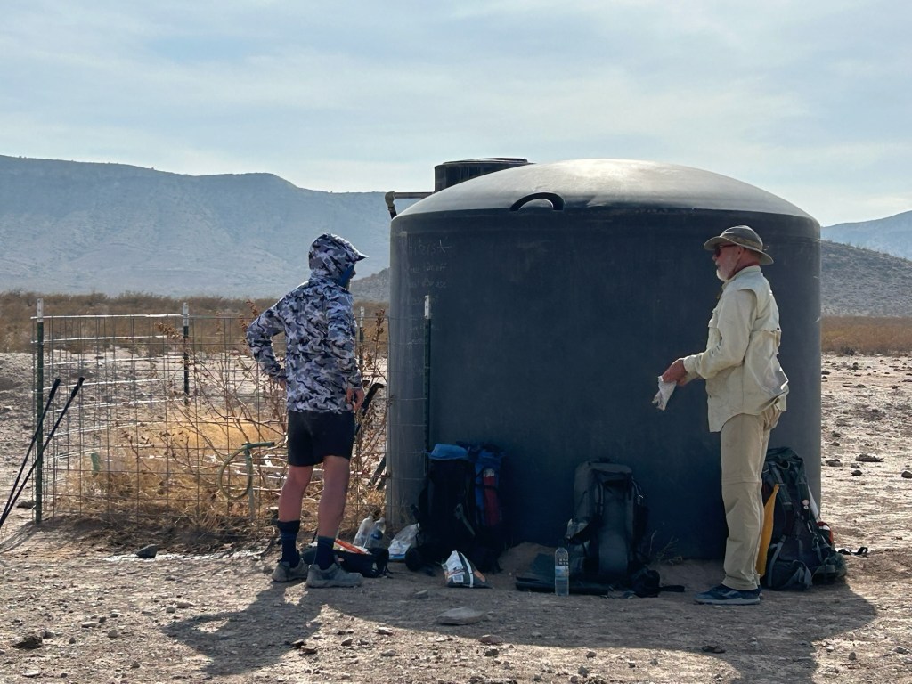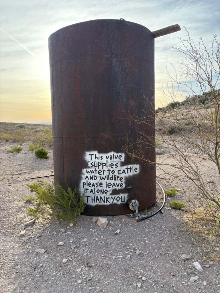 We took a break in the shelter of a juniper for a quick snack, then pushed on to TLC Ranch. There was water and an outhouse and a table and chairs. But since it was so cold, we opted to sit against a tank in the sun and out of the wind.