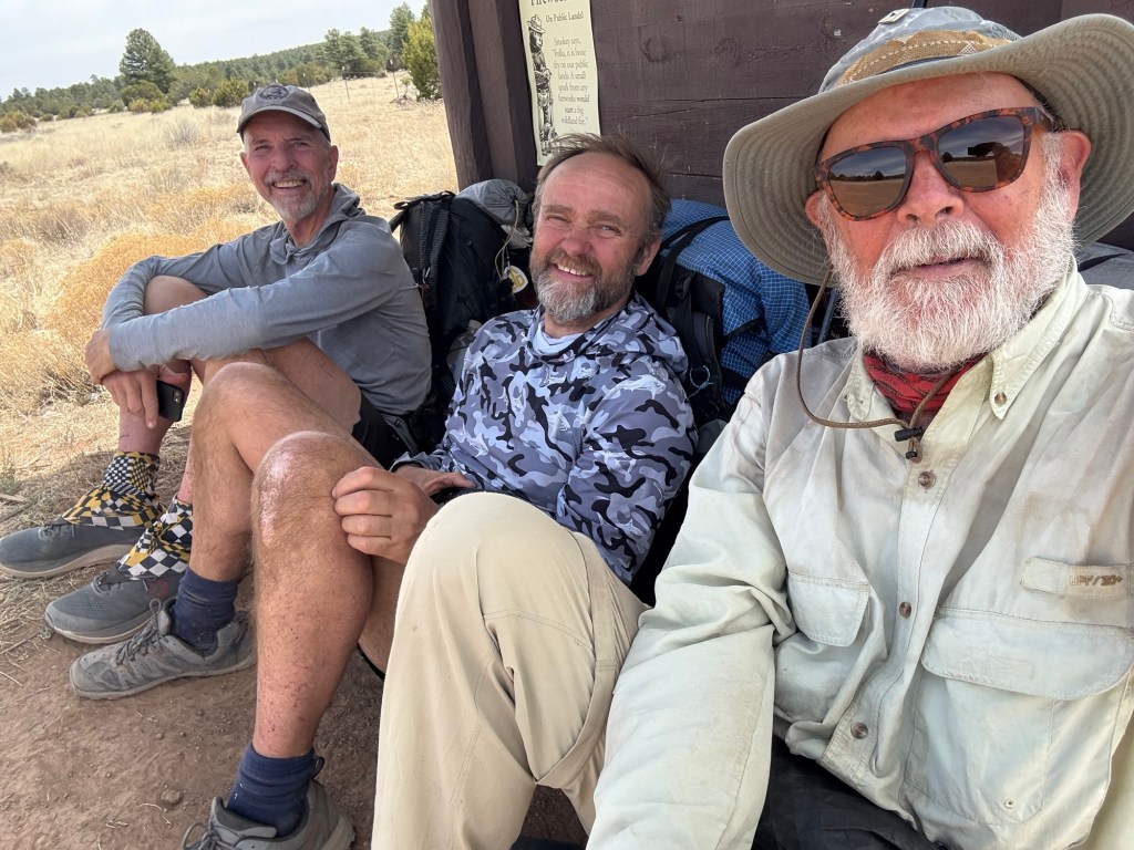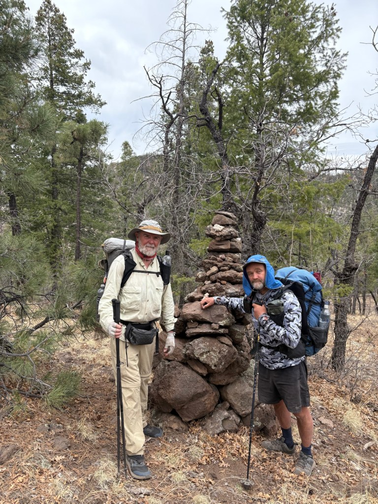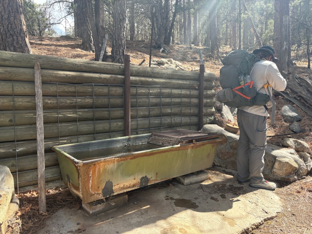 After another fine breakfast at Smokey’s diner, we headed back to the hotel to finish packing and to wait for the shuttle. Chad arrived at 10:30 and after a quick stop for gas we were on our way to the trailhead. There was another hiker there when we arrived. His name was Nico and he followed us briefly up the trail before we lost him. It was a steady and reasonable climb along a dirt road, through juniper and ponderosa pines. We stopped for brief rest at about 4 miles. At just over 8 miles we came to the turn off for Patterson tank. Just then Michelle rode up. She’s doing the trail with three horses and a dog, and she said a rancher had told her there is water at a spring near a campground a mile ahead. She decided to water her horses at Patterson tank and we pushed on to the campground. Spokes andMT went to fetch water while I watched our packs. It turned out to be good spring water; much nicer than the cow tank.