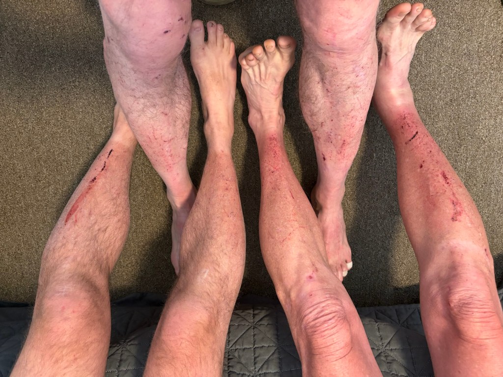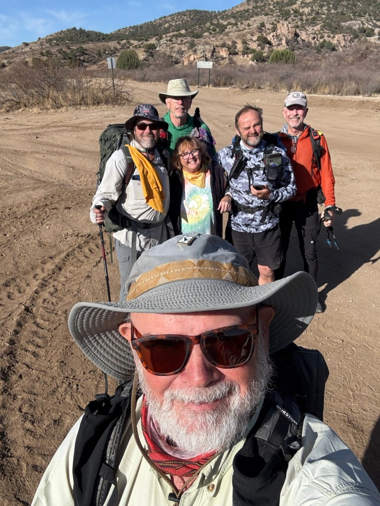 The trail began with a few miles of short but steep ups and downs before eventually leveling off a bit, and beginning a long gradual descent. While still up high, it began to hail, and that continued for at least a couple of hours. We pulled on rain gear and soldiered on. The hail stones were pretty small and melted on us quickly, which would have made for damp clothes otherwise. Eventually, after about 9 or 10 miles, we descended into Saddle Rock Canyon and followed it down to a gate where trail angel Susie arrived. One-K, Spokes, and I were there when she drove up, and Bard and MT strolled up a few minutes later. All five of us and our packs piled in, and off we went. After a brief stop at Walmart, we went to Susie’s house, where she fed us chili and salad and promised French toast in the morning. Then she’ll take us back to the trail in the morning. We plan to leave most of our gear at the hotel we booked for tomorrow and slack pack the road walk into town.
