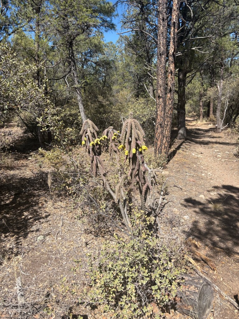 We took our first real break of the day at Engineers Windmill and water tank. The day had been cool and we didn’t need much water. We took our lunch break among some mistletoe trees to shelter from the cool breeze, then pushed on. It was a steady climb as we passed into the Gila National Forest and we saw our first truly engineered trail of the hike. We also saw our first CDT trail blazes nailed to trees. Eventually we arrived at a water cache just a bit south of NM Highway 90, at almost 6100 feet of elevation. We decided to camp here, as there are numerous flat spots among the trees and bushes. The temperature is supposed to get down into the 20’s tonight and my water filter is in the foot box of my quilt, to keep it from freezing.