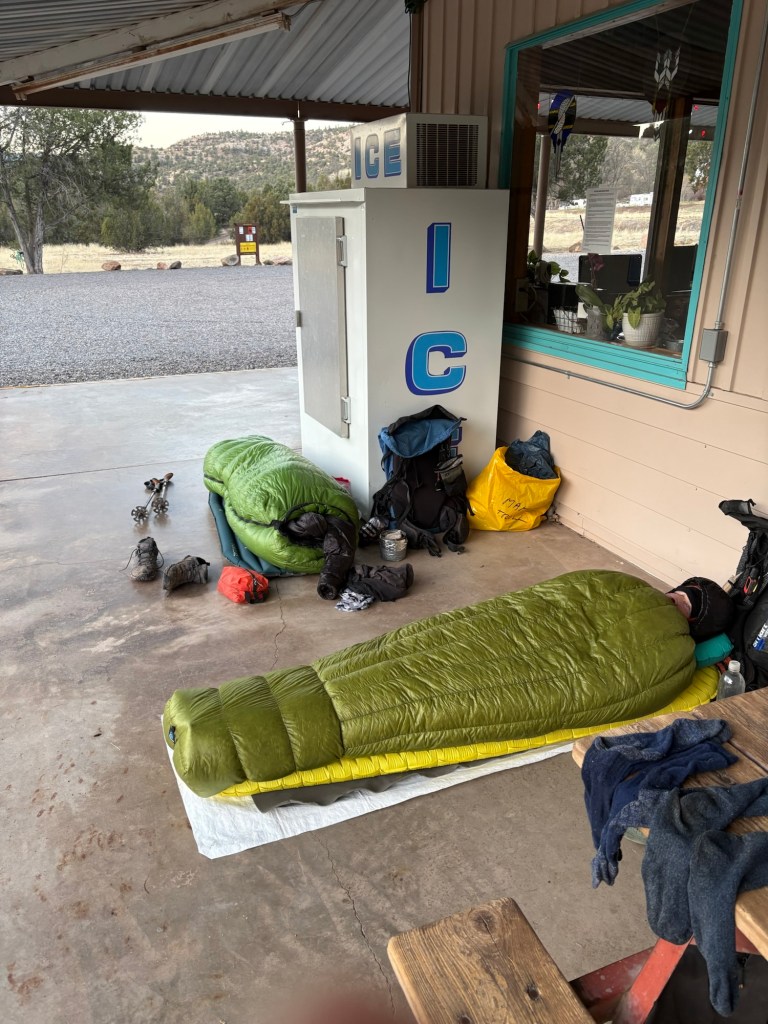 After a nice night cowboy camping on the back patio at Doc Campbell’s, we woke up about 7:00. The owners had coffee ready at 8:00, and we had a bit of breakfast. My water filter had escaped the foot box of my sleeping quilt during the 30 degree night, and I could not be sure it hadn’t frozen. So I bought another one. Better safe than sorry, especially with some of the cow tank water we’ll be drawing from pretty soon. We started hiking after 9:00.