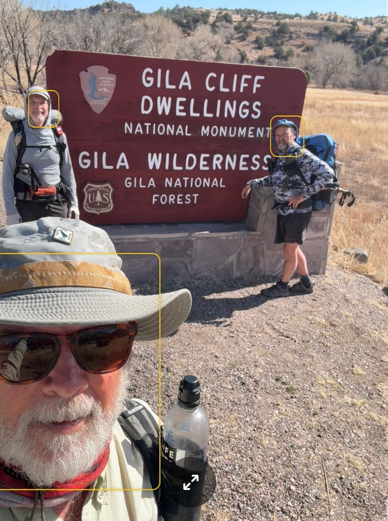 Anticipating the many river crossings ahead of us, we slept in until 6:00 to ensure good daylight. Shortly after starting to hike, we found ourselves doing a rock scramble up a short steep rock face, and I worried a bit about what the rest of the day had in store for us. But that was the only scramble of the day. The first few miles were kind of “choose your own adventure” and what trail there there was hard to follow. But eventually the trail was marked with rock cairns and was a beaten footpath, making it easy to follow. We startled a javelina early in the morning, which wanted nothing to do with us. We also came upon a group of wild turkeys. We spotted a few ducks, some raptors (peregrine falcon, I think) and a huge trout in the river. Between the river crossings the path was mostly level, but each crossing involved a short steep descent to the river, and a short steep climb out of the river. By my count, we forded the Gila River exactly 50 times today. About 1.3 miles from Doc Campbell’s Post the trail merged with a paved road and we road walked to the store. It was closed, but we called the number on the door and they came over to open up for us, so we could buy our resupply for the next leg. They also sold us showers and baked a frozen pizza for each of us. They offered to give us a ride to the campground down the road, but later offered to let us camp on the store property (which is normally not allowed). Then they brought out a cooler full of ice water and said good night. Pure kindness. So we have a picnic table, flush toilets, and internet! Hiker heaven.