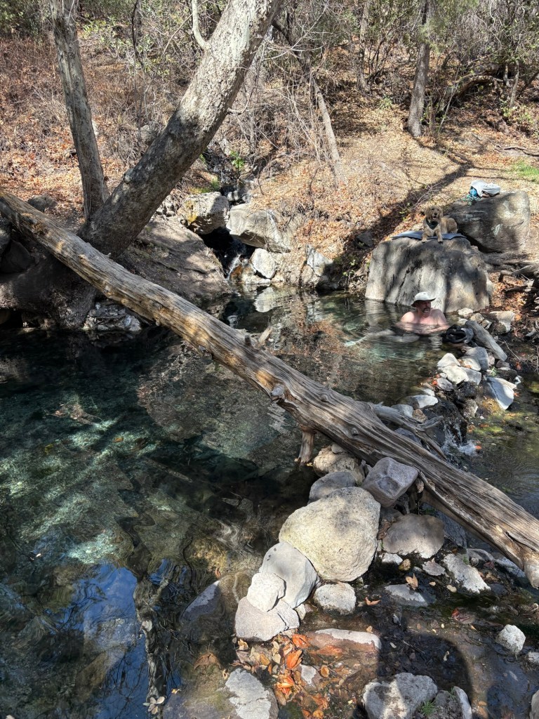 There was one guy in the hot springs pool when we arrived but he was happy to share. We went in with our clothes on, since we were so sweaty. After a half hour soak we packed up and came across the river to this site.