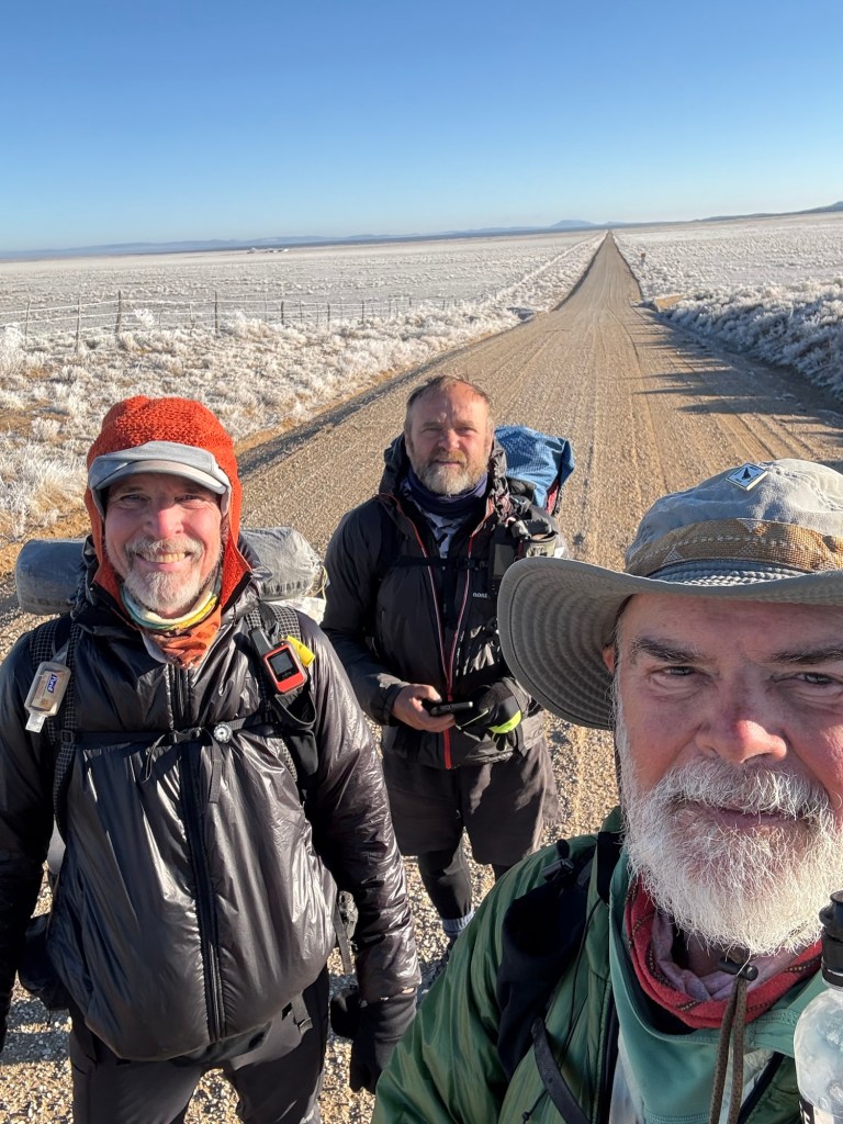 We woke up with our water bottles frozen nearly solid. The tents were covered with frost, inside and out. My thermometer read 11 degrees at 6:00. After coffee and a quick breakfast we were on the road. Literally. It was another road walk on a gravel road. As the sun came up, so did the temperature, and the day became rather pleasant. Much better than yesterday. We had almost 19 miles to go to the next water source, and the water bottles thawed in good time.