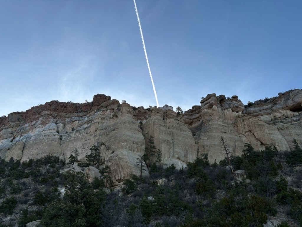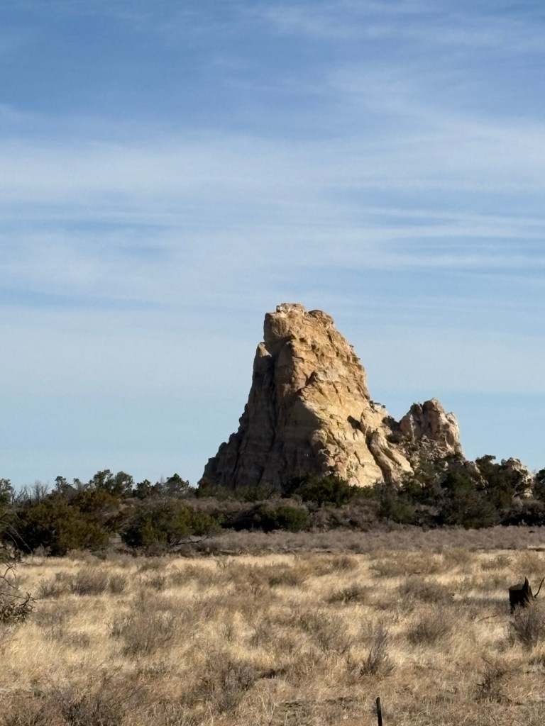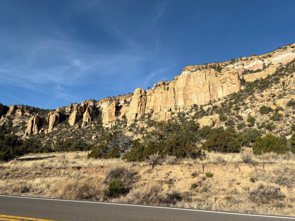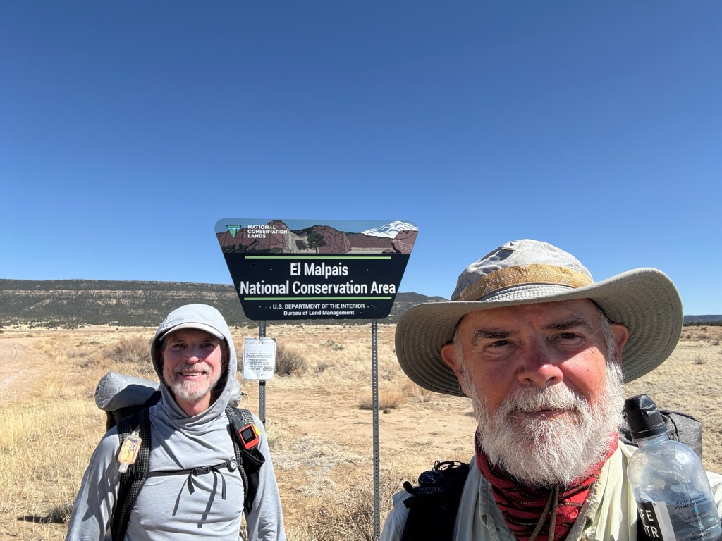 We were up at the usual time, and we made a stop at the picnic area for the pit toilets. The temperature was 20 degrees this morning, so better than yesterday. Then we began the long road walk along the highway to Grants, NM. We were passing through the Acoma Pueblo Reservation. The first half of the hike had spectacular views. The cliffs were beautiful in the morning sun. We passed by the Ventana Arch and stopped briefly for some photos. Then it was just a long slog along a paved road. We stopped at a closed ranger station for lunch on a picnic table. There was water available from a spigot, but we hadn’t used much while hiking in the cool morning. From there we pushed on until we came to Interstate 40 and a gas station with a Subway shop. We stopped for a sandwich before heading out for the final 6 or 7 miles to our hotel. We followed old Route 66, and it was fairly busy. The last bit was kind of dangerous- a busy 4-lane overpass over the railway with no sidewalk or shoulder to walk on. But we made it safely to the Motel 6 and checked in. After showers and laundry, we went to Denny’s for supper; the classiest option in the neighborhood. That’s the end of my hike, and I’ll be heading home from here.