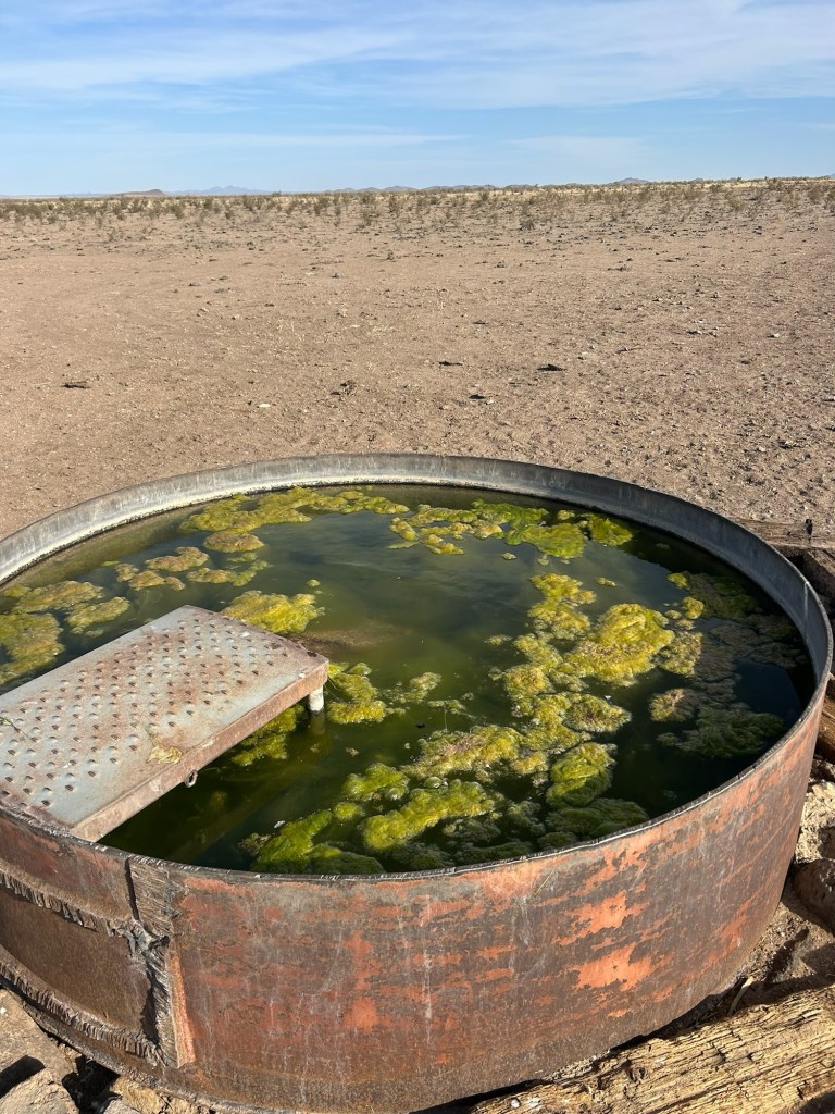 At the rancher’s water tank, we took about an hour break and had a little lunch. Mama Troll walked up about 20 minutes after we arrived. We sat in the shade of the tank and chatted a bit. Spokes had arrived before us and he left 30 minutes before One-K and I left. When we left, Mama Troll (henceforth known in these pages as MT) was still there filtering water. He planned to push on another mile or two. From the tank, it was again another 7 miles to the next cache.