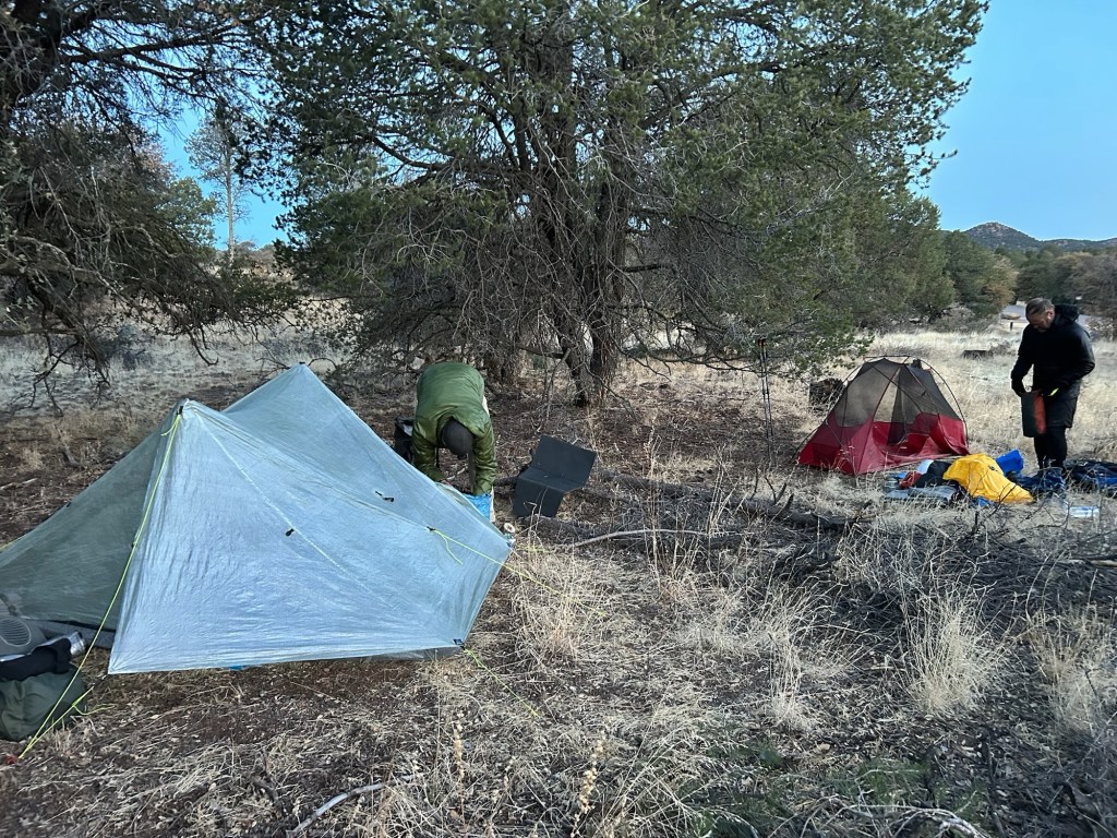 After that break we pushed on to a solar well and opted to camp near the water rather than push on to a dry camp. Even though it was kind of early (4:15), the weather was still cold and snowy and we’d come 22 miles. We set the tents up right close to the downwind side of a juniper and filtered water and had supper. It’s supposed to be 22 degrees at 6:00 in the morning, but it’s also supposed to be 59 degrees late tomorrow afternoon.