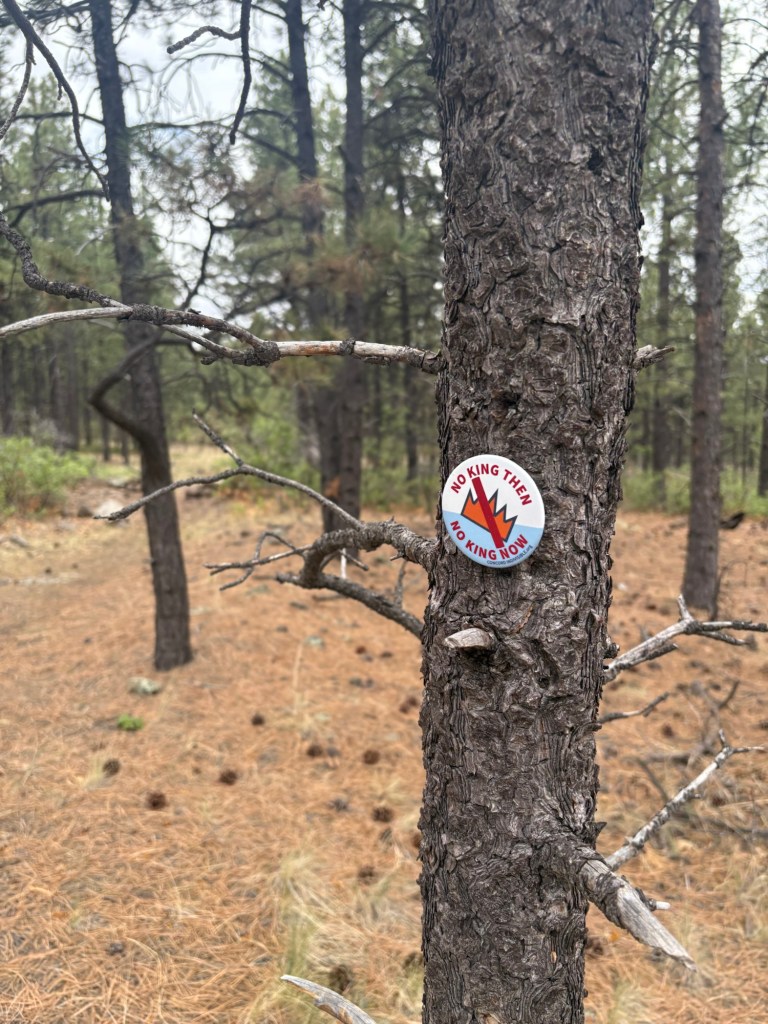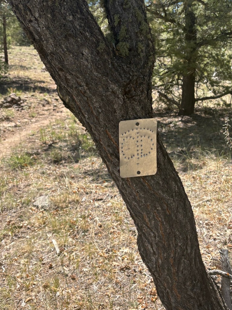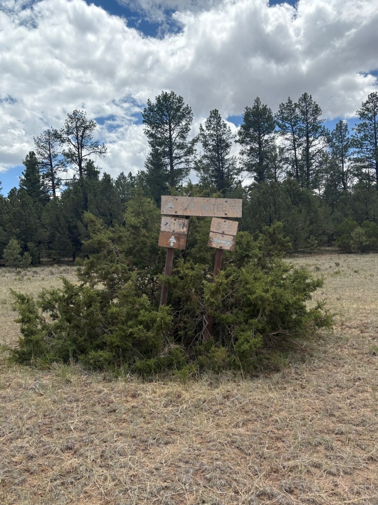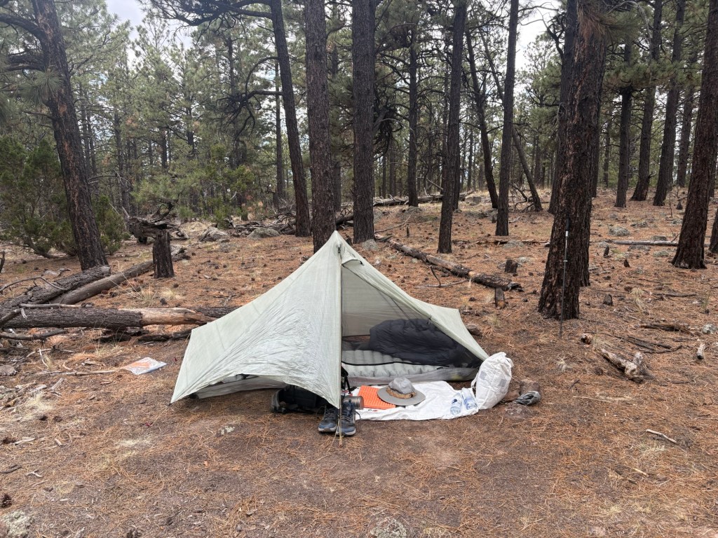 From there, it was about a 7 mile road walk out of town, before turning onto a proper trail. Along the way I chatted with a guy just leaving the dog park with his dog; and further down the road I chatted with a guy who was walking/jogging with his dogs. Nice folks in that town. After the road walk the trail was a 2 mile/1000 ft elevation gain climb. It started at 6800 feet and after 2 miles it was 7800 feet. I really felt the altitude, having spent the last two months at sea level, until yesterday. Not enough oxygen. After the steep part the trail mellowed into a more gradual climb. Where it leveled off a bit, there was a bell to ring and a hiker logbook. I entered my trail name and took a minute to enjoy the nice view of Grants down below. As I turned to go, I spotted two deer farther down the trail. They didn’t hang around. But as the miles wore on I was feeling the altitude more. Not bad, but I noticed it. During the afternoon it began to rain, so I broke out the poncho and wore that for the rest of the afternoon, even after it stopped raining. I didn’t want to stop to take it off. After 18.5 miles I came to a junction with a road and the trail that goes up Mt. Taylor. There was a water spigot in a rancher’s water pipe there. I filtered some water and decided that 18.5 miles is enough for the first day back on the trail. So I walked across the road and found a place to pitch the tent. I’ll give my body some time to adjust to the altitude before climbing some more. I’m at 8900 feet now, and will top 9600 feet tomorrow.