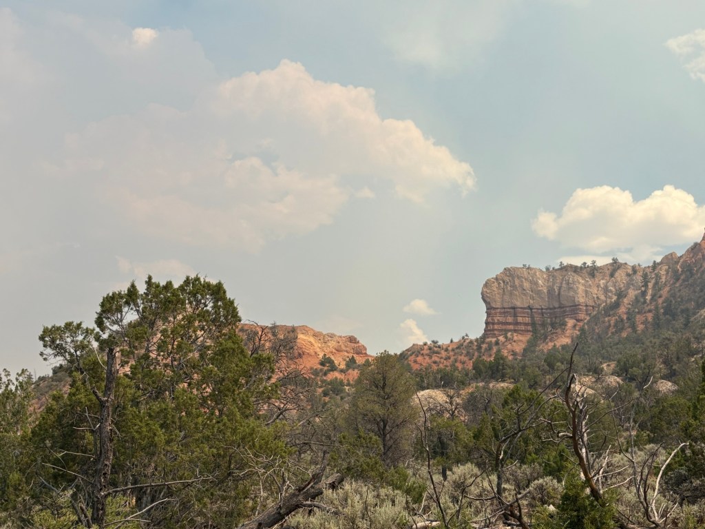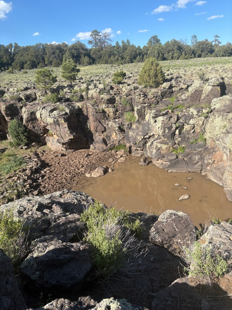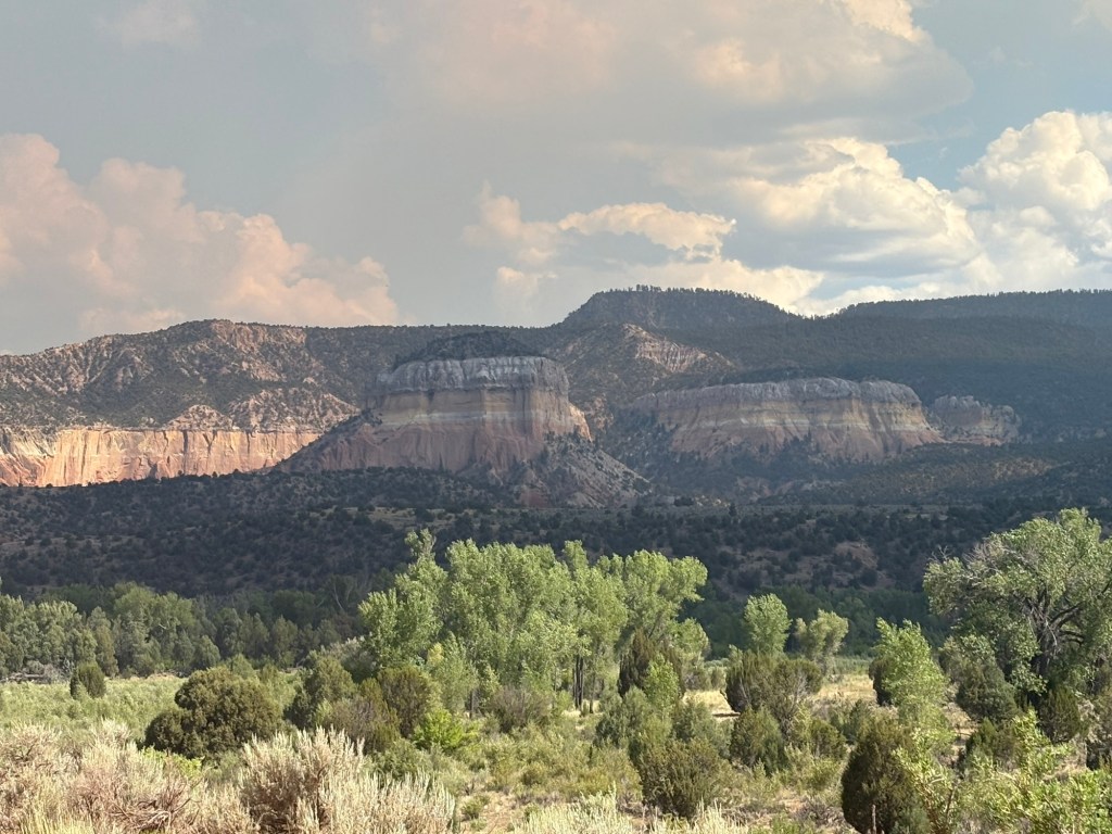 As I worked my way down, I began to see and faintly smell smoke. The smoke was pretty high up in the air and I couldn’t determine where it came from. I knew there were fires to the east, and I’d heard about one to the northwest. I wasn’t really nervous, but I was a little concerned. I stopped for a liter of water at a small stream and continued on. The downhill became much steeper and there were many small stream crossings with steep banks of both sides, similar to the Gila River. Much smaller streams though, and no wet feet. At the bottom, the country opened up, with some terrific views. I stopped for water at another cattle trough; this one was surrounded by bamboo. I hid in the bamboo shade while filtering water. The trail joined a road and continued across the Chama River. From that point the trail diverges. The regular trail goes up hill and the Ghost Ranch alternate heads east along the river. I’m going to Ghost Ranch, since I mailed a supply box there. After about two miles I came to Whirlpool Dispersed campground. Lots of tents sites tucked away; no designated spots. There is a pit toilet. I should be in Ghost Ranch tomorrow morning. I’ll do a blister check and see if I feel like leaving the same day. If not, I may overnight and leave very early the next morning.