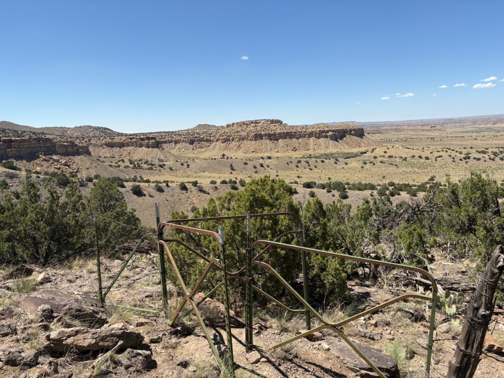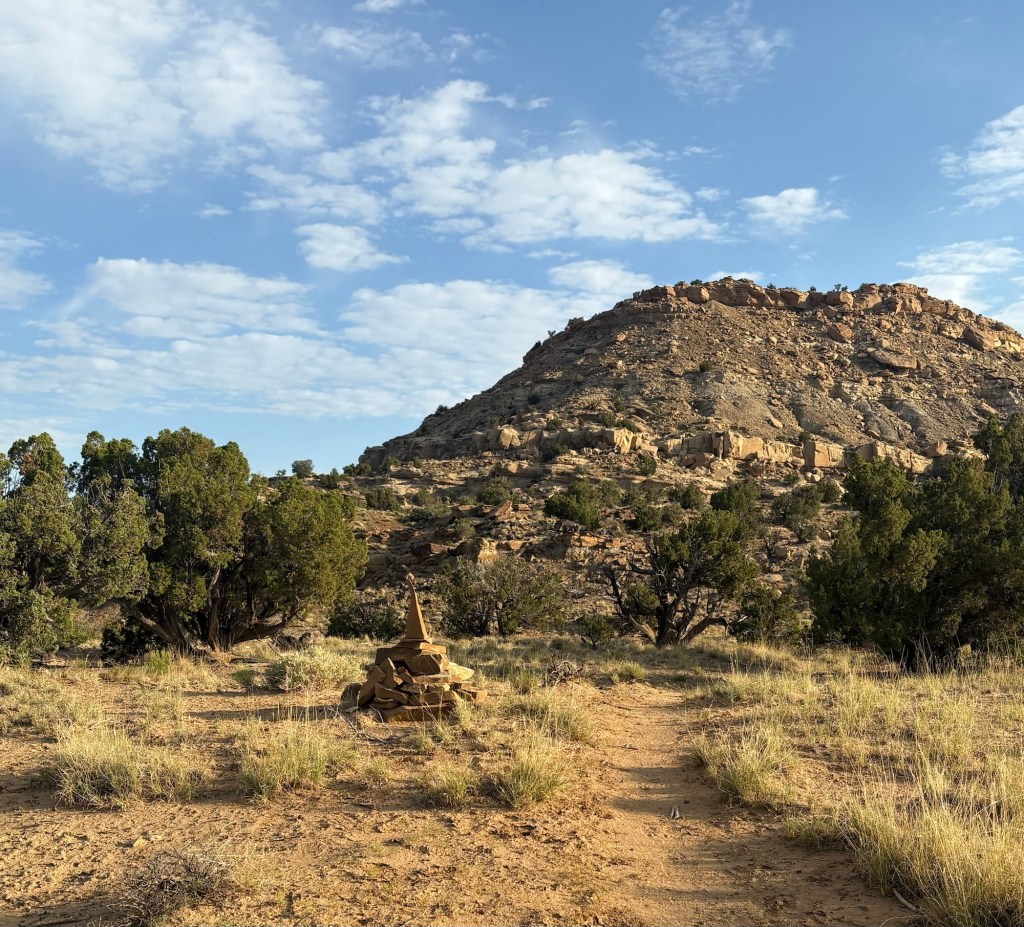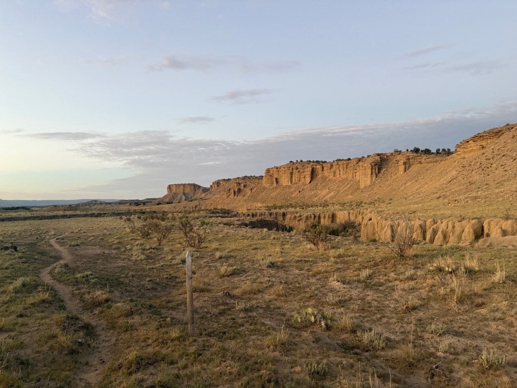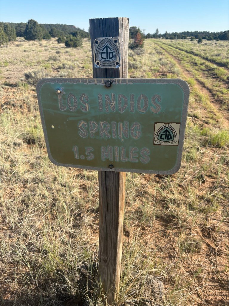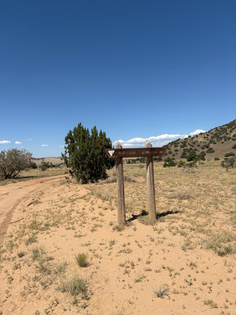 It was a quiet night, and there were a few clouds in the sky when I took my 1AM pee break. I was up at 4:30 again and hiking by 5:30. There was a short climb to get the blood flowing, but then fairly easy going to the next water source. It was a spring and there were some old ruins just above it. I didn’t take the opportunity to check them out, since I wanted to get to town before the afternoon heat. I cameled up and put on some sunblock and had a snack. From there the trail tended downhill slightly for a couple of miles before tending upward again. After about four miles I came to a short and very steep climb. It was tough – climbing up rocks in some places with the trekking poles in one hand and using the other hand to help pull myself up. It was only about a half mile, but I took a break in some shade about .2 mile from the top before pushing on through. At the top, the trail joined a sandy road and it was pretty level cruising. I was making good time, and the trail tended downhill towards town. The last six or seven miles were road walking, and the last four of that were along a paved highway. I arrived in Cuba at about 1:00PM, and stopped for lunch at the first cafe I saw. Then I arranged for a hotel for two nights. I’ll be taking a zero tomorrow to let my blisters rest and get a bit of a resupply for the next leg. I was more conscious of my water intake during the last day or so, and my appetite seems to be returning. I think it should be just over two days from here to Ghost Ranch, my next stop.