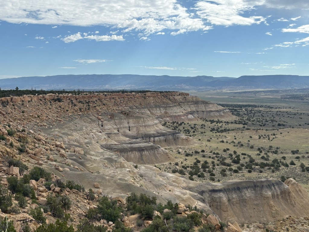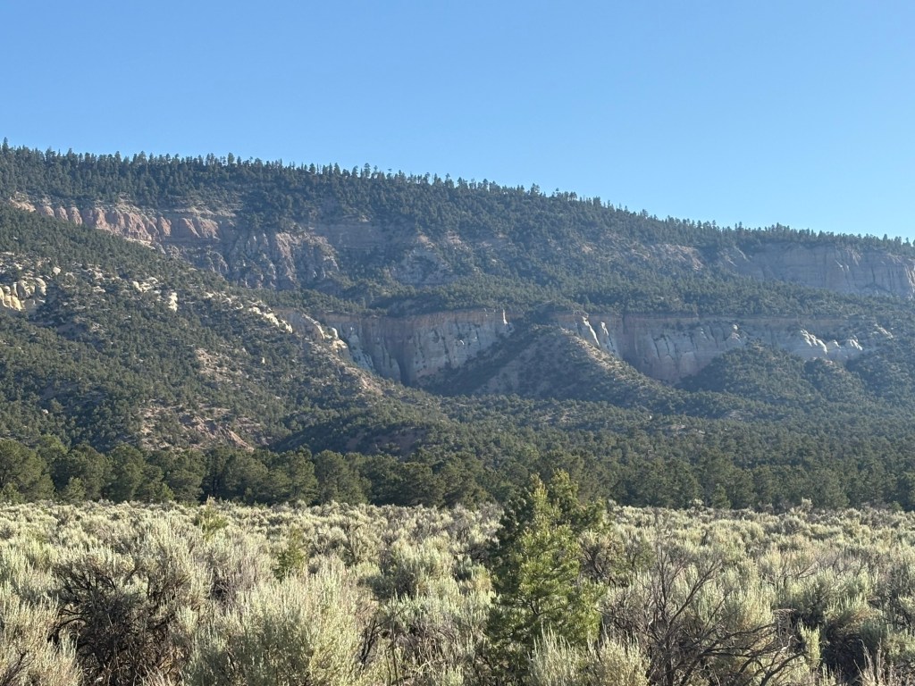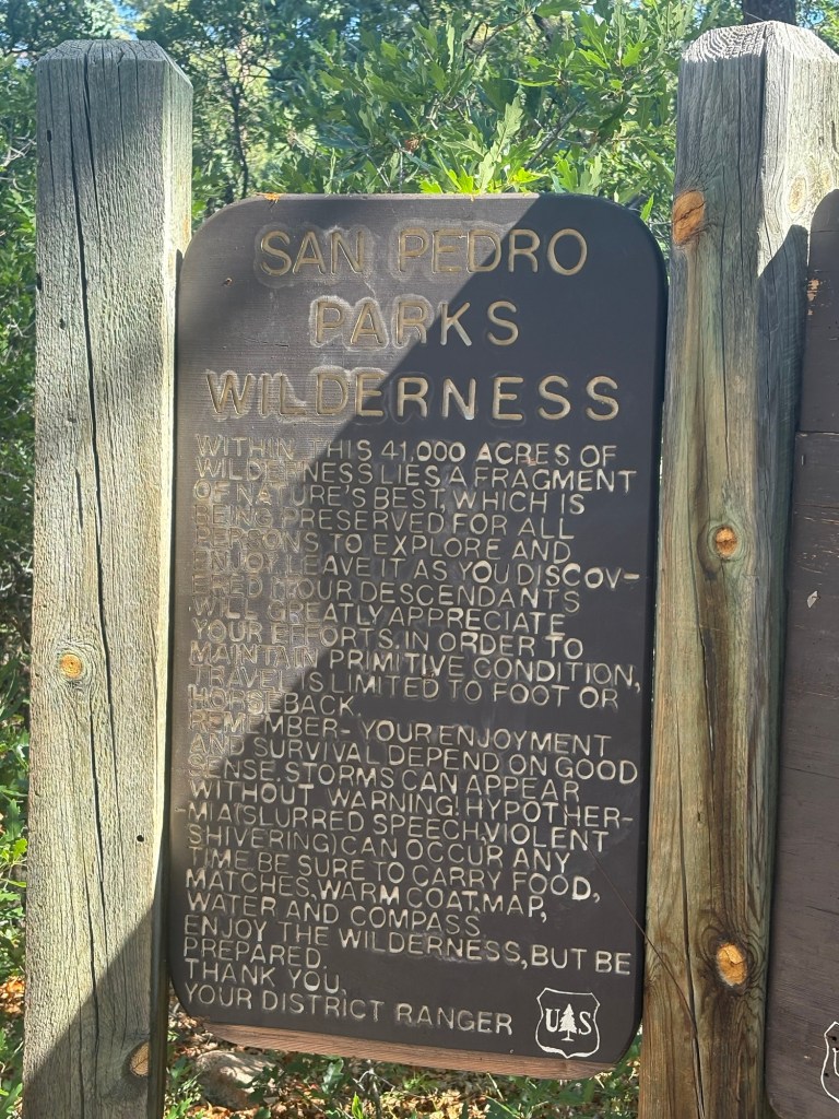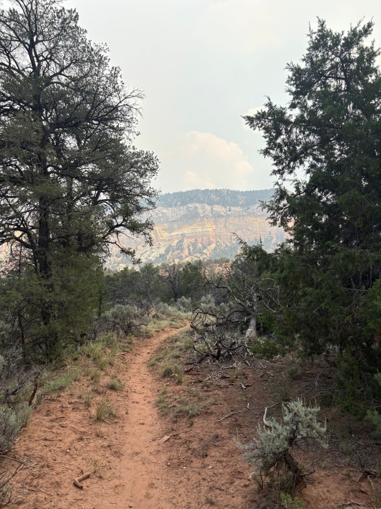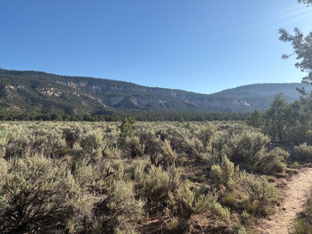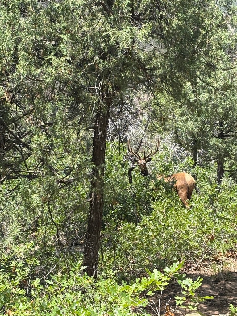 Soon after began the slog up to Mesa Alta. I was glad to be doing this in the morning, rather than mid-afternoon. I just went into low gear when needed. I picked up some water from a cattle trough after about 11 miles. By then the day was warming up. It would reach mid-90’s in the afternoon. Shortly before the downhill off the mesa began, I heard a sound uphill and to my right. When I turned, there was another bear about 75 yards away. It moved a short distance away and the stopped to look at me. I pulled out the phone, thinking I could zoom in enough for a decent photo. She raised up on her hind legs to get a better look, and then I saw her cub moving in the brush. I’ve seen firsthand how fast a bear could close that distance, so I walked on. Looking over my shoulder. Then began the downhill. About 15 minutes into it, I heard some noise in the brush off to my left, as something moved away from me. When I looked ahead, there was a beautiful buck frozen and looking at me. I got a picture that time, and then he took off like a shot.