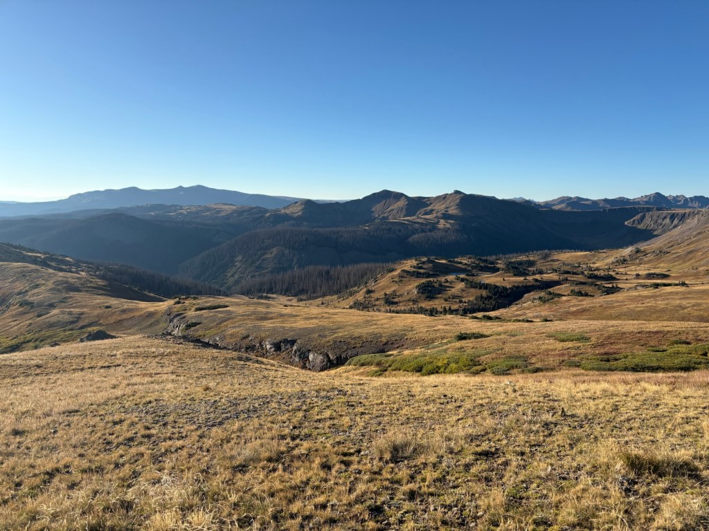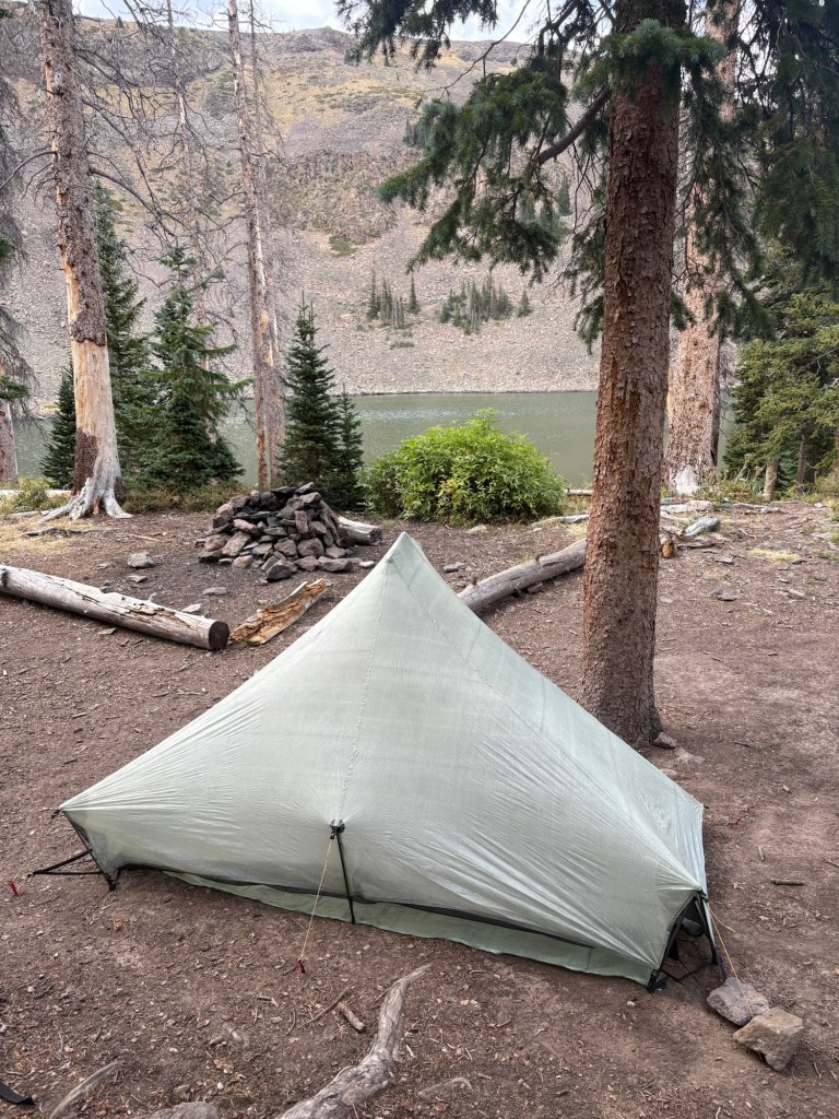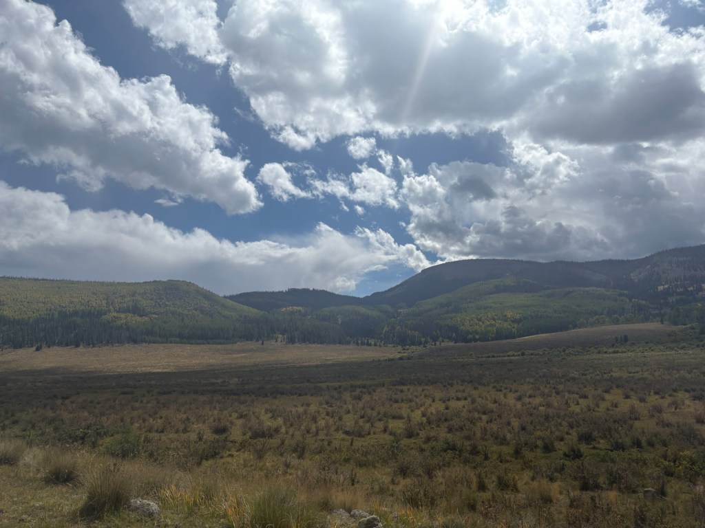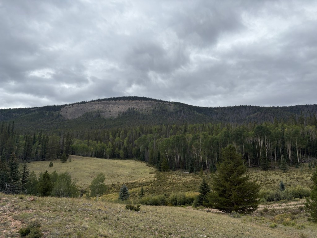 So I was hiking out of town shortly before 8:00. It began as a road walk, and in about 2.5 miles I crossed the Rio Grande. At about 3 miles I left the road and started up the Deep Creek trail. I encountered several day hikers in the first few miles, and then didn’t see another person for about 10 miles. The trail climbed steadily and then steeply, topping out at around 11,500 feet. It rambled along above 11,000 feet for a few miles and then began descending alongside the Roaring Fork Creek. Lots of cattle around. It rained a couple of times, and was a bit breezy up high. I met a single female day hiker who said she lived in the area, but saw no one else. Then the trail began descending sharply to Fisher Creek where I found a decent camp site and quit around 4:00. I set up camp and cooked dinner. It began to sprinkle, so I moved to the tent to finish up.