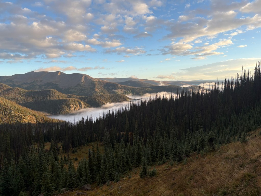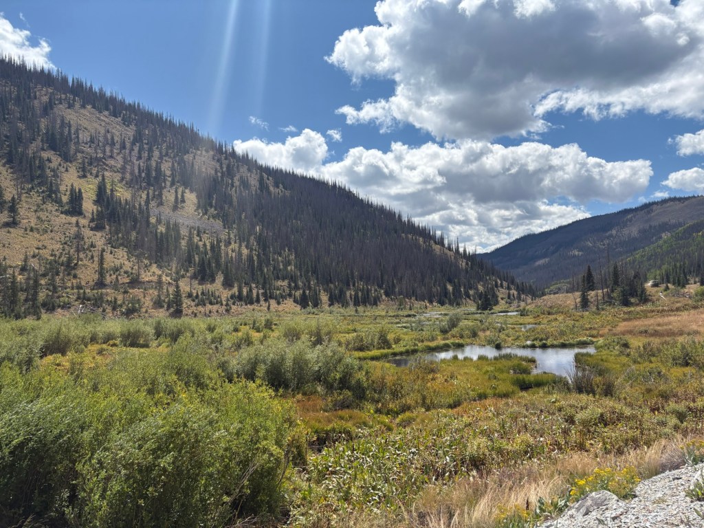 I should have been well rested after my zero day in Creede and my early stop time yesterday. But the 8 miles back to the CDT, following the Creed Cutoff, was a bit of a challenge. After crossing Fisher Creek the trail followed Goose Creek up the valley almost all the way back to the CDT. Earlier in the year there had been a tangle of blown down trees on the trail, some at switchbacks. That had made the trail difficult to follow, let alone walk on. Recently all that had been cleared, but that 8 miles still had its fun with me. The first couple of miles were relatively easy, but eventually the trail began to climb and become overgrown. While walking through waist-high grass my foot sunk into mud up to the ankle. And because of the high grass, and multiple trails (some were no-doubt animal trails)I briefly lost the trail and bushwhacked up a steep slope to rejoin it. Also, it rained hard for 15 minutes or so, and then stopped. A couple of times I heard what I believe were wolves yipping across the creek on the other side of the valley. It didn’t sound quite like coyotes, anyway.