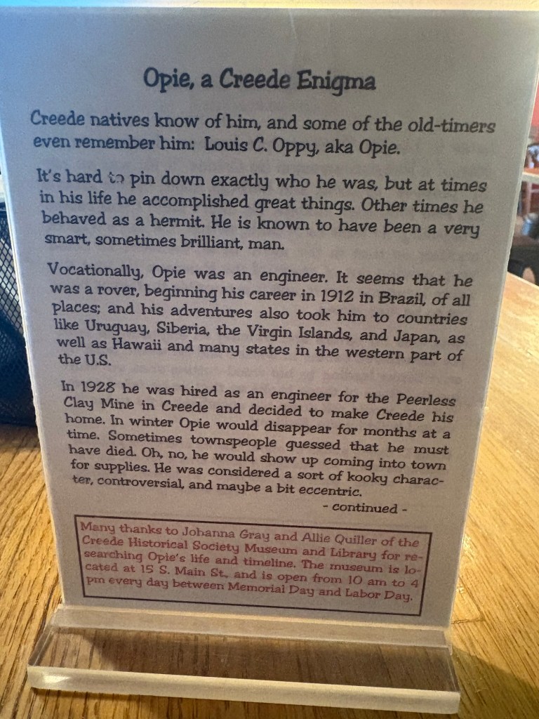 Shortly after turning towards Creede I met a couple out for a day hike and we had a short conversation. The trail tended downhill and after several miles joined a gravel parking area and road. There is a popular off-road vehicle trail that begins at the parking area and I saw a lot of those vehicles on my way to town. The first one I saw stopped to talk and offered me granola bars, etc. I politely declined, since I’d be in town soon. Nice folks.