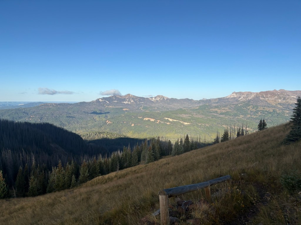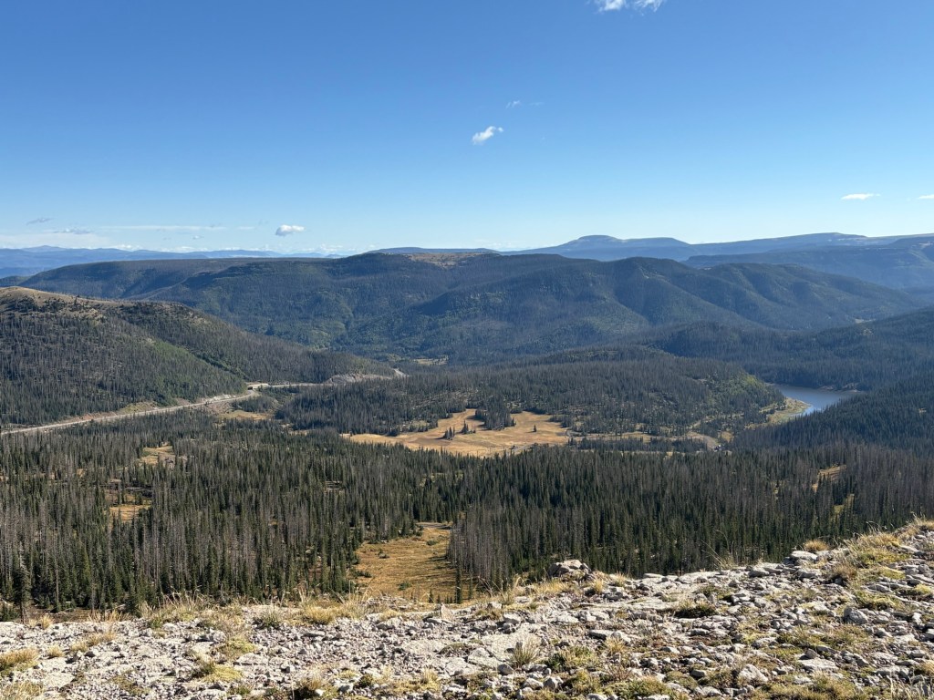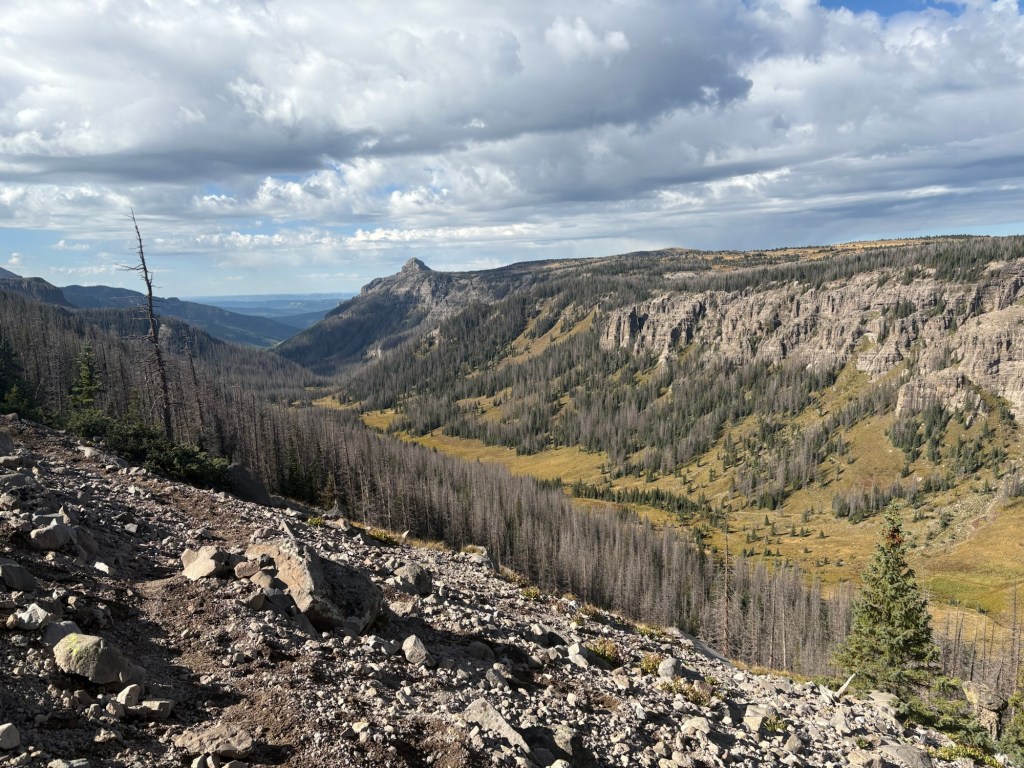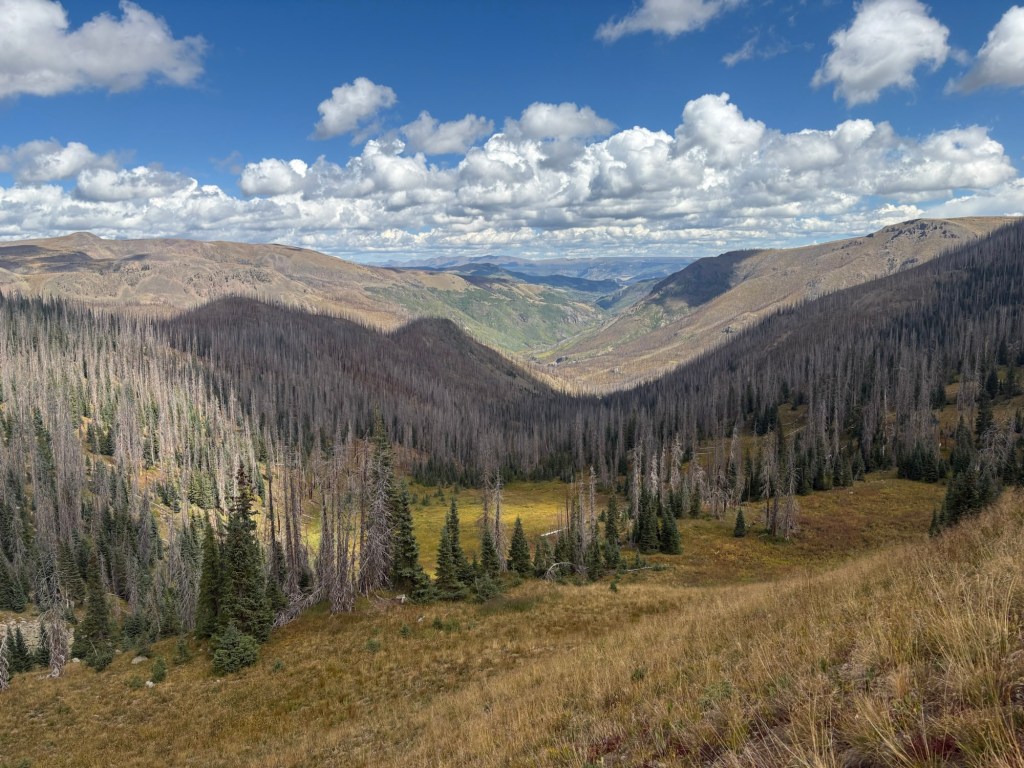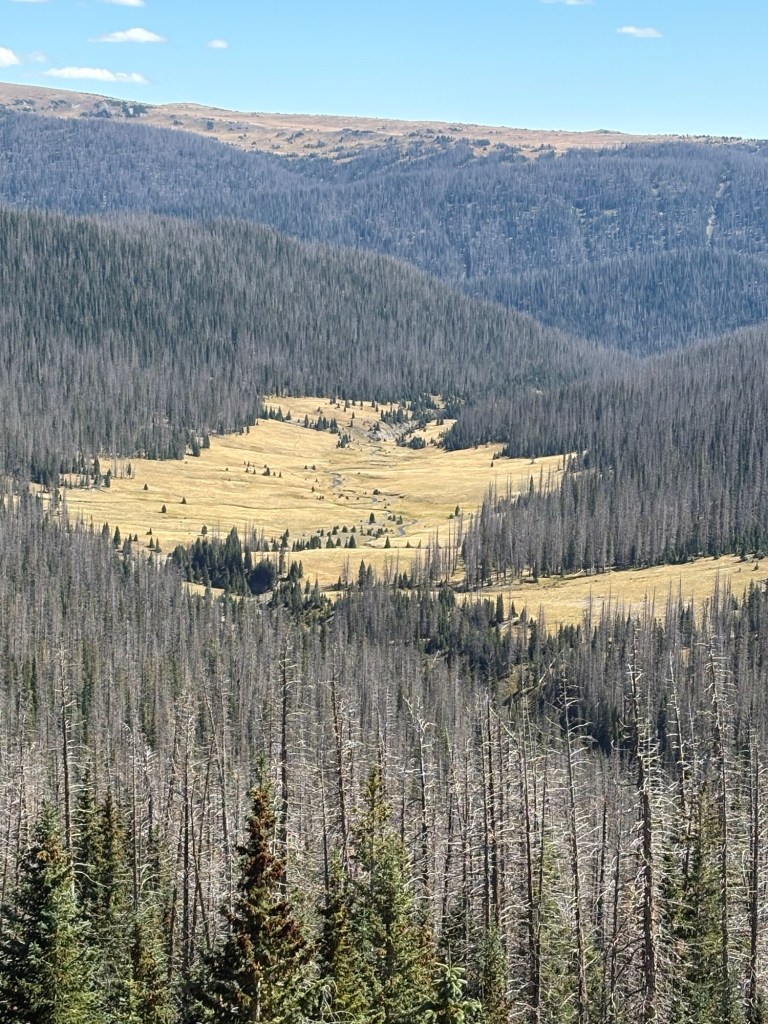 There was a four mile climb after the creek and I stopped for a snack when I reached the top. After that it was the usual ups and downs, through forests of mixed live and dead trees. Beetles have killed tremendous amounts of trees here.