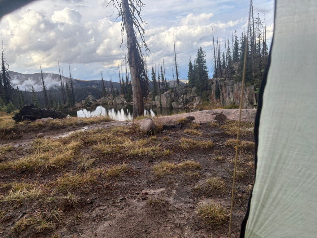 Just beyond Archuleta Lake the thunderstorms began in earnest. I was no longer on the ridge, but several hundred feet lower, so I kept going. I was thinking it would just be a brief storm. Wrong. I hiked another 4 miles to get to this camp. The trail had become a muddy stream, and footing was tricky. My shoes and socks were completely soaked. I was trying to get to Wolf Creek Pass to bail out and hitch a ride to town. But I was getting wet, even with rain gear, and I started to worry about hypothermia. So I pulled up here and pitched the tent. I changed into dry clothes and hunkered down in the tent. The storm abated long enough for me to grab some water from the lake and cook dinner. But it just returned with a vengeance. It’s loud in the tent with the rain coming down, to say nothing of the lightning and thunder. I hope everything holds together. I think I’ll try to get to the pass in the morning and hitch a ride to town.
