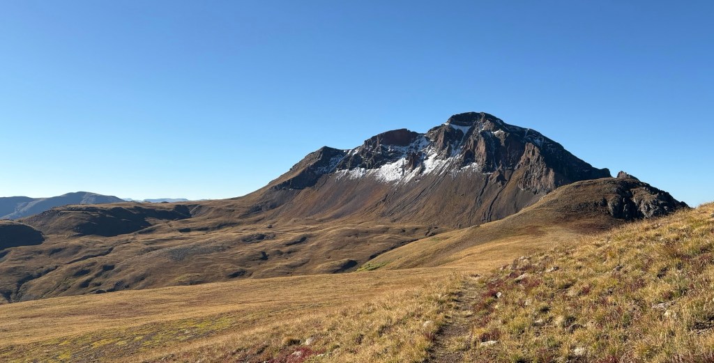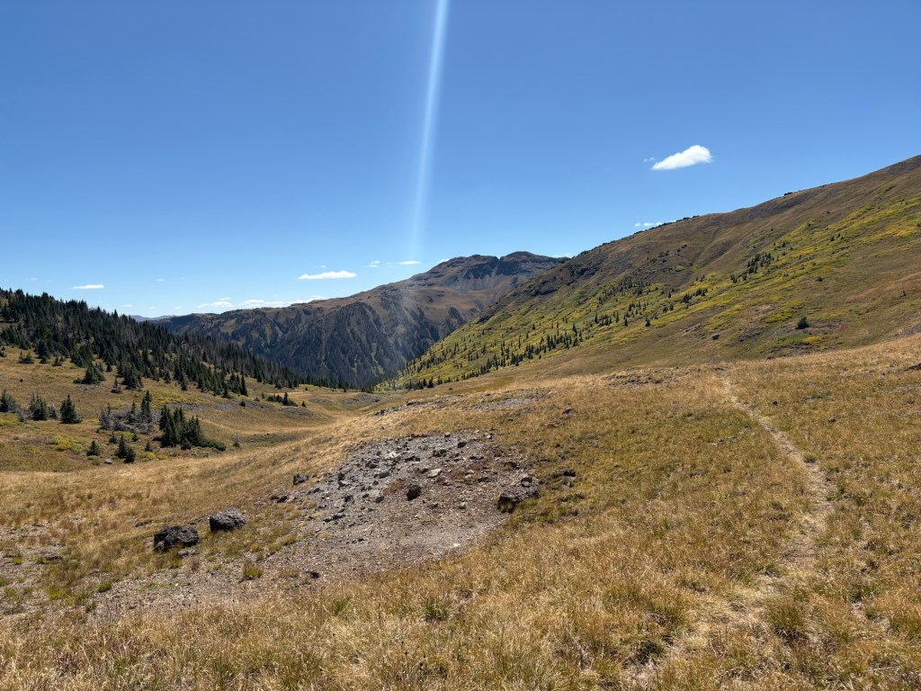 At the saddle there is a trail junction- a side trail leads to the top of San Luis Peak. After cresting the saddle I met one hiker heading for the peak. There were thin clouds hanging around the peak and he hoped they’d dissipate.