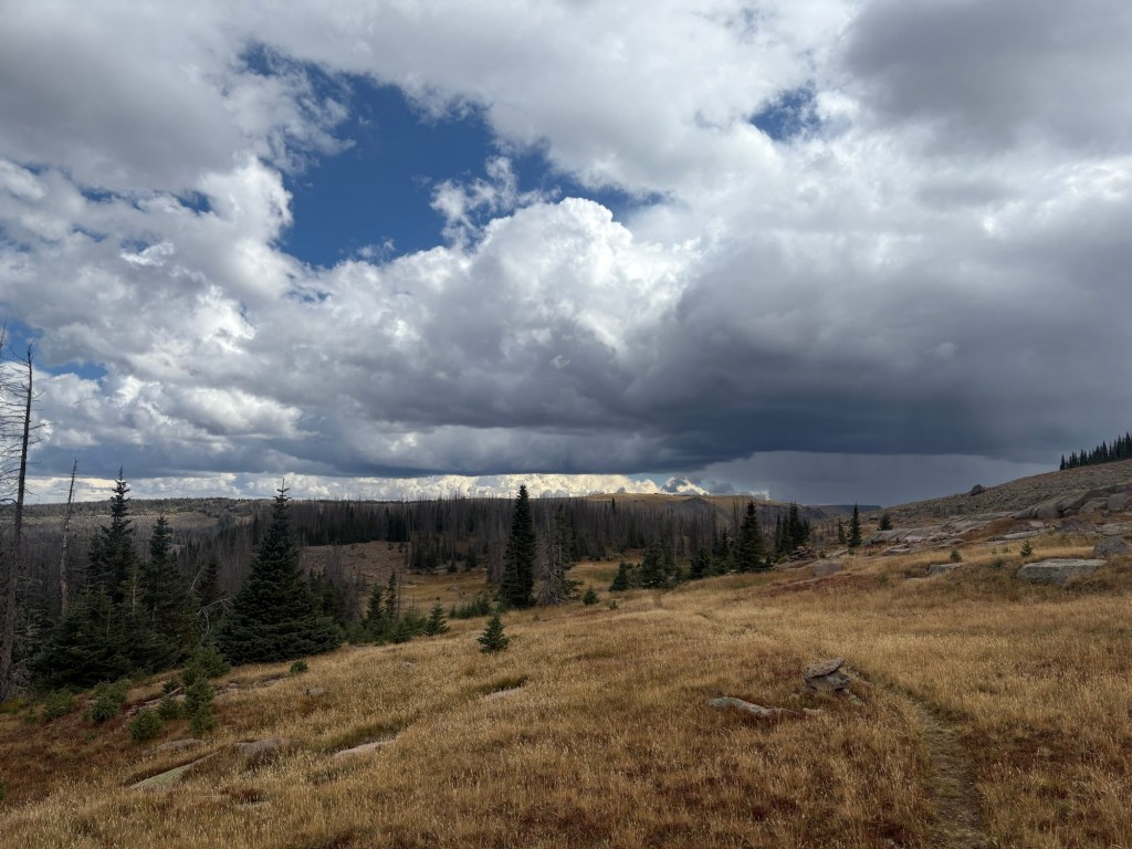 The trail was above 12,000 feet at least three times today; once for three or four miles. It was very windy up high, and there were short periods of rain and hail to add spice to the wind.