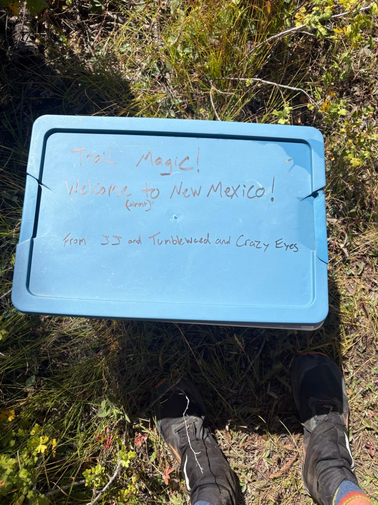 When I left, Dizzy was still having his breakfast. I thought he’d catch me, but I didn’t see him again. It was very chilly until the sun rose high enough to warm things up. At first the trail was mostly in shade, which kept it pretty cold. Eventually it warmed up, and I was able to shed layers of clothing. After yesterday’s 12,000 feet, the trail was more moderate, and it wasn’t nearly as windy. The sky was mostly clear, just a few high clouds blowing by. The views were fantastic. With a few moderate climbs, the trail tended downhill to Cumbres Pass. In about 10 miles I came to some trail magic – a plastic container filled with beer, wine, and soda. It was labeled “Welcome to New Mexico”. Then I passed under a railroad trestle and came to the highway. From there, I intended to hitch to Chama. As I was just finishing stowing my trekking poles and pulling out my “Hiker To Town” sign for hitchhiking, a car came by and I stuck my thumb out. They pulled over to give me a ride. Amazing – the first car pulled over before I’d had a chance to use my sign. It was a nice couple, and we had an enjoyable conversation on the way to Chama. They dropped me off at a bar/restaurant, which turned out to be closed. It was just 11:00, and I had time to figure out my next step. On the boardwalk in front of the establishment I stretched out my tent to dry in the sun and the breeze, and started figuring out buses and flights.
